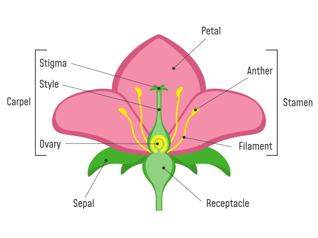 Çiçek; çanak yaprak, taç yaprak, erkek organ ve dişi organ olmak üzere dört ana bölümden oluşur. Bu yapıların birlikte çalışması üremeyi mümkün kılar.