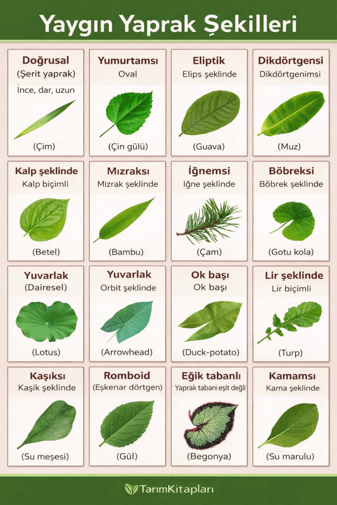 Yaprak çeşitlerinin bu kadar fazla olması, bitkilerin yaşadıkları ortamda hayatta kalabilmek için geliştirdikleri uyum stratejilerinin bir sonucudur. Bu nedenle yaprak nedir ve tiplerini tanımak, sadece botanik bilgi değil; tarımda bakım uygulamalarını doğru yapmak için de çok işe yarayan bir anahtardır. Yaprak çeşitleri ile ilgili şu linkte bir makale önerimiz mevcuttur. Aşağıdaki fotoğraftan da yaprak çeşitlerini inceleyebilirsiniz.